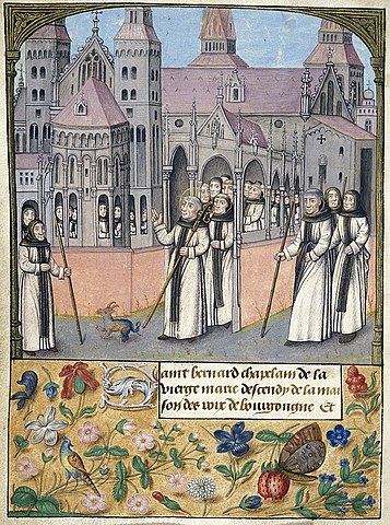 [Illumination from Chroniques abrégées des Anciens Rois et Ducs de Bourgogne. Southern Netherlands, c. 1485-1490. Collection: British Library, London, UK. Translation text: Bernard of Clairvaux, chaplain of the Virgin Mary leaving his house on his way to Burgundy. The church depicted is not Clervaux Abbey as is to be expected but the Church of Saint Servatius in Maastricht. Unknown 15th-century illuminator (attributed to: Master of the Trivial Heads) / public domain, Wikimedia File:K105354-Bernard of Clairvaux (British Library).jpg]